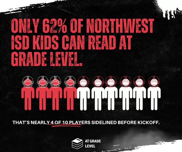 New school year. New season. But in Northwest ISD, nearly 4 of every 10 kids can’t read at grade level. We can’t start this season on the sidelines. Parents — check your child’s reading and challenge our district to get every kid in the game. |